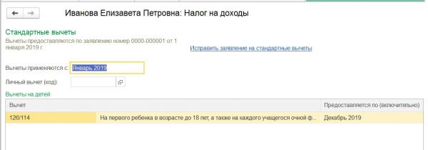 Сотрудница Иванова Е. П. В январе 2019 года принесла заявление о предоставлении ей вычета на первого ребенка.