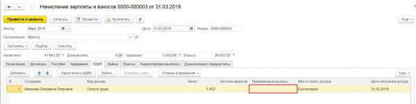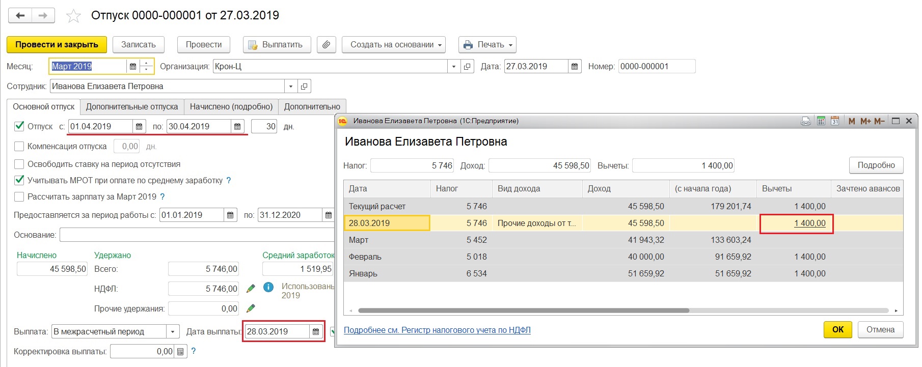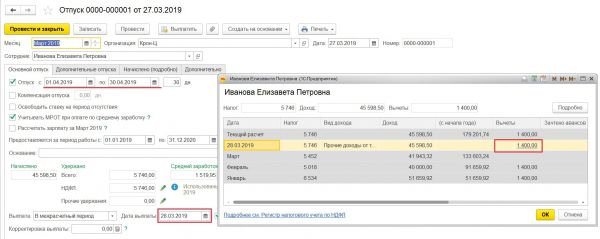 При этом при расчете отпускных был предоставлен стандартный вычет за март в размере 1400 руб. Почему применили вычет за март, ведь фактически в отпуск сотрудница ушла в апреле? Так вот, по отпускам датой получения дохода признается дата его выплаты = 28.03.2019. Т.к. выплата произошла в марте, то и доход признается мартовским.