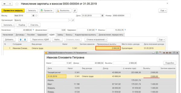 Т.к. Иванова Е. П. весь апрель была в отпуске, то ей никаких начислений не положено, и соответственно вычеты за апрель не применялись. В мае она вышла на работу и отработала весь месяц. При этом, при расчете зарплаты мы увидим, что ей применился двойной вычет.