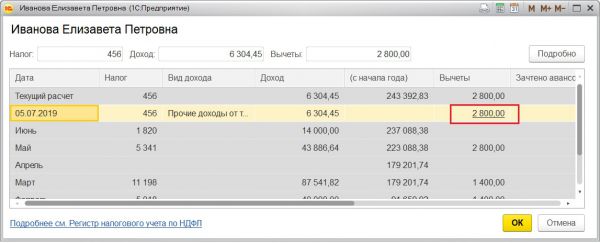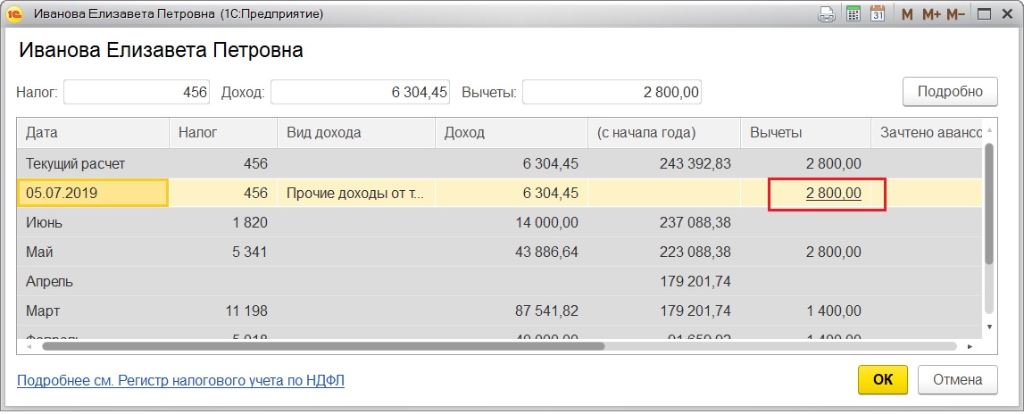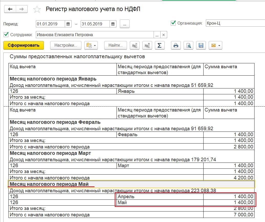 В данном случае, двойной вычет ошибкой не является, т.к. стандартные вычеты применяются нарастающим итогом в течение налогового периода (в соответствии с п.1 ст. 218 НК РФ). Соответственно, программа увидела, что в апреле вычет использован не был, и добавила его в расчете за май. Подтверждение этого мы увидим в Регистре налогового учета: