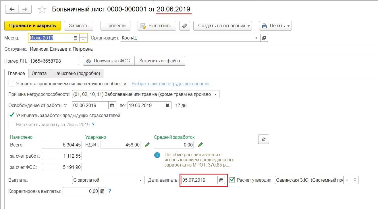 Эта же сотрудница Иванова Е. П. 20.06.2019 принесла справку о болезни. В расчете больничного листа мы указали, что сумма будет выплачена с ближайшей зарплатой, т.е. 5.07.2019.