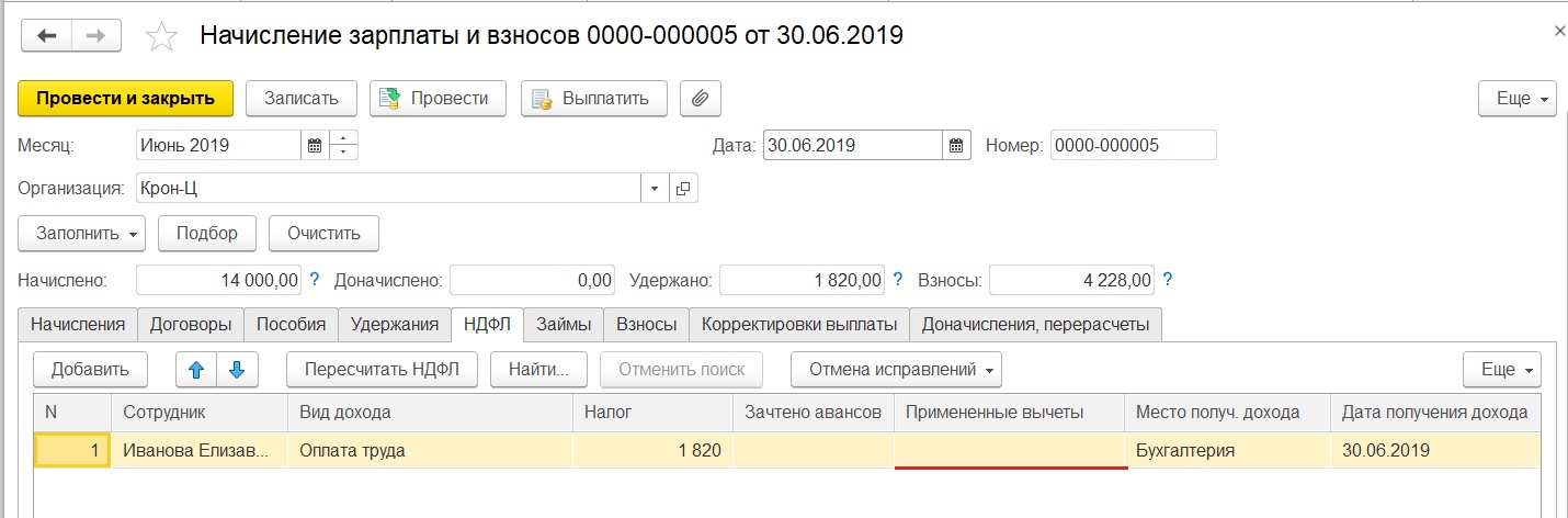 Обращу внимания, что при дальнейшем расчете зарплаты за июнь, вычет применяться не будет, ведь он уже использован при исчислении НДФЛ с больничного листа.