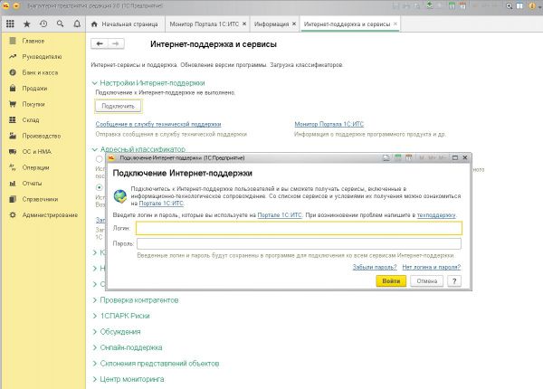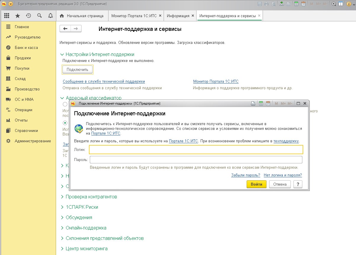 Для подключения демо - доступа к сервису 1Спарк Риски, программа 1С должна быть зарегистрирована в Личном кабинете на сайте Портал 1С:ИТС, и подключена к интернет-поддержке в разделе Администрирование/Интернет-поддержка и сервисы. Для авторизации в системе интернет-поддержки пользователей используется тот же логин и пароль, которые используются на Портале 1С:ИТС. Пользователь может выполнить регистрацию самостоятельно или обратиться к партнеру фирмы «1С», с которым организация заключила договор.