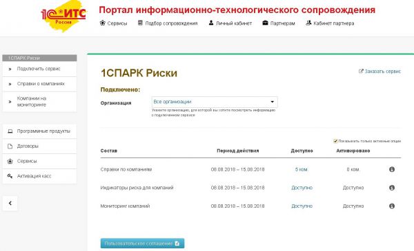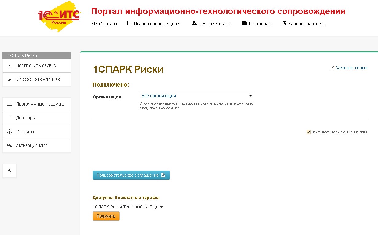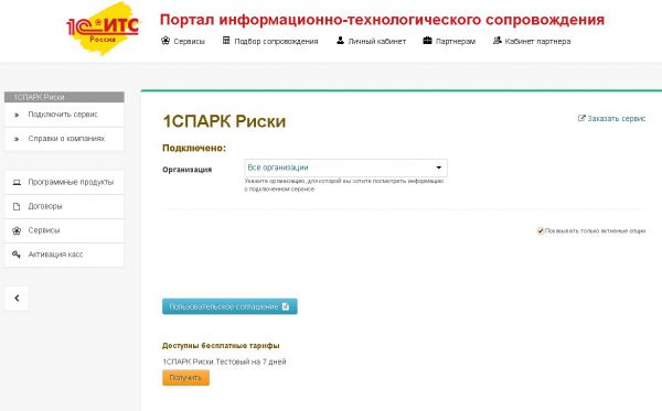 Перейдя в личный кабинет, в разделе Сервисы, выбрать 1Спарк Риски и получить тестовый доступ к этому разделу на 7 дней.