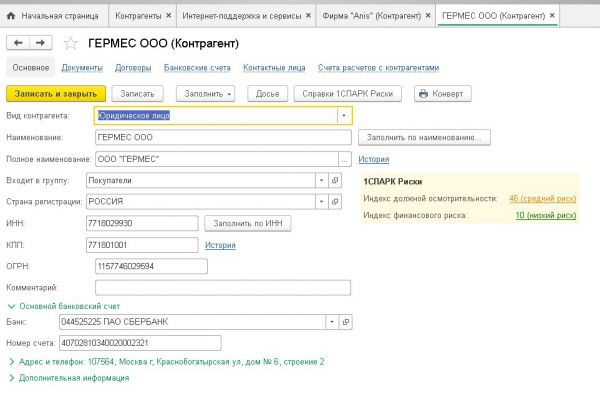 Индексы постоянно обновляются, позволяя контролировать ситуацию не только в начале сотрудничества, но и на всем его протяжении. Сервис отслеживает изменения в жизни контрагента. Ликвидация, банкротство, реорганизация, смена руководителя, адреса, учредителей – информация об этих и других важных событиях поступает в 1С. Например, при занесении нового контрагента в программе 1С можно увидеть – все ли в порядке с контрагентом.